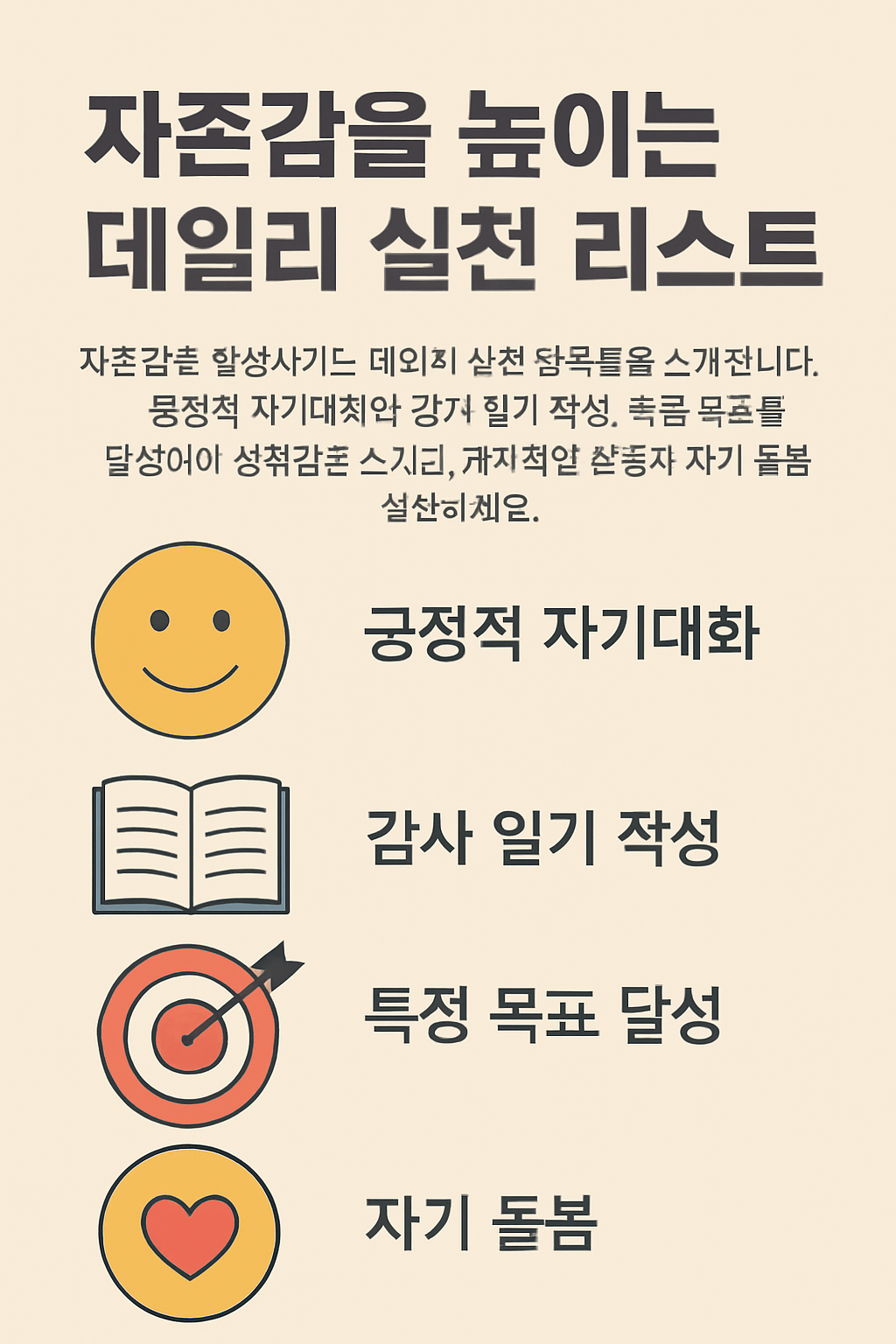 자존감은 우리의 자아를 지탱하는 가장 중요한 심리적 기반입니다. 하지만 바쁜 일상과 비교 중심의 사회 구조 속에서 많은 이들이 자존감 저하를 겪고 있습니다. 이를 회복하기 위한 가장 효과적인 방법은 일상 속에서 꾸준히 자신을 긍정하고 돌보는 루틴을 실천하는 것입니다. 이 글에서는 심리학적 이론을 바탕으로 누구나 쉽게 따라할 수 있는 자존감 향상 데일리 실천 리스트를 제시합니다. 아침에 일어나는 순간부터 잠들기 전까지 자존감을 높이는 다양한 행동들을 단계별로 설명하고, 각 실천 항목이 심리에 미치는 긍정적인 영향을 분석합니다. 자기비하에서 벗어나 진정한 자기신뢰로 나아가기 위한 실질적 가이드를 통해 독자 여러분의 일상에 긍정적인 변화를 불러오길 바랍니다.